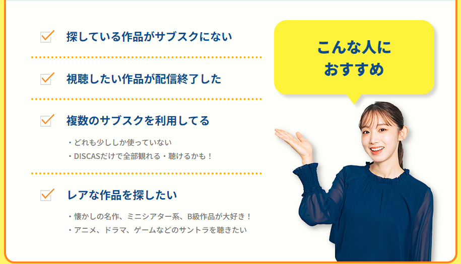 TSUTAYA DISCAS | 〇 | ・DVD・CD・コミックの取扱い国内最大級の宅配レンタルサービス ・単品レンタルプランなら1枚から最大16枚まで借りられる ・探している作品がサブスクにないこんな人におすすめ ・初回会員登録の特典として、単品レンタルクーポン630円分をプレゼント | 単品レンタル料+送料のみ |